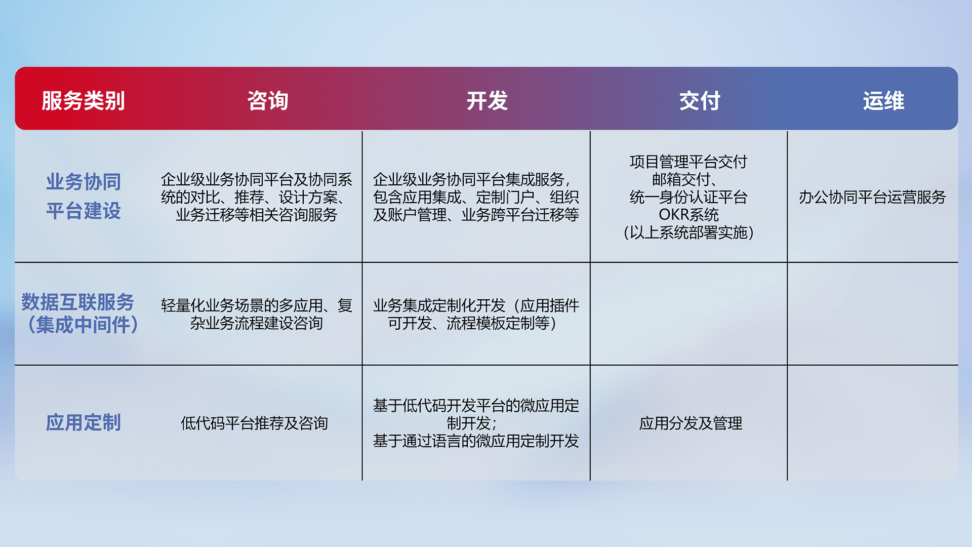 针对钉钉、、、、企微、、、、IDaas等平台级产品提供产品的规划、、、、方案、、、交付、、、、定制化开发等服务,,,,实现如统一协同办公、、、、智能客户服务、、、、混合会议管理、、智能数据查询、、等业务场景,,,实现数字化转型。。。。